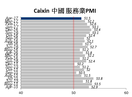 財新網 4 日公布,今年 4 月財新中國通用服務業經營活動指數(服務業 PMI)為 51.5,低於 3 月的 52.2,連續 4 個月下滑,為近 11 個月以來最低;此走勢與中國官方服務業 PMI 一致(中國國家統計局公布,4 月服務業 PMI 為 52.6,低於 3 月 1.6 個百分點);受製造業、服務業 PMI 雙雙走低的影響,4 月財新中國綜合 PMI 資料(包括製造業和服務業) 為 51.2,低於 3 月 0.9 個百分點,為近 10 個月來最低紀錄,顯示中國經濟成長動能進一步趨緩。
