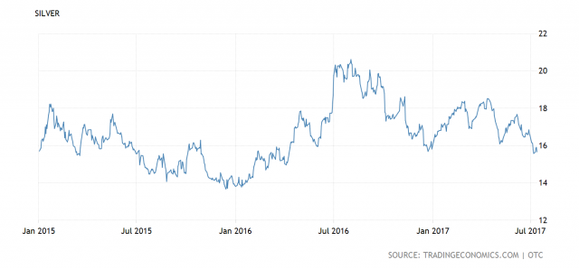 Martchev 17 日在 MarketWatch 發文,宣稱 2017 年金價將跌破 1,000 美元,大概有五成機率成真。如今銀價一路走跌,看似要回測 2015 年 12 月低點(見下圖)。白銀往往引領貴金屬走勢,貴金屬市況好時,白銀領漲,表現更勝黃金;貴金屬走弱時,白銀也會領跌,一如當前情況,黃金未來走勢恐會受壓。