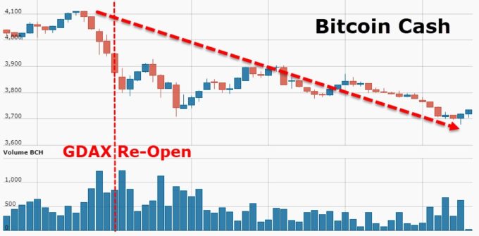 傳統比特幣悽慘,「比特幣現金」則上漲兩倍,從 19 日的 1,850 美元、20 日一度來到 4,000 美元(見下表)。Coinbase 的「比特幣現金」報價更誇張,站上 8,500 美元,比其他平台報價高出 250%。價格異常促使 Coinbase 在「比特幣現金」上線後 4 分鐘,就暫停相關交易。