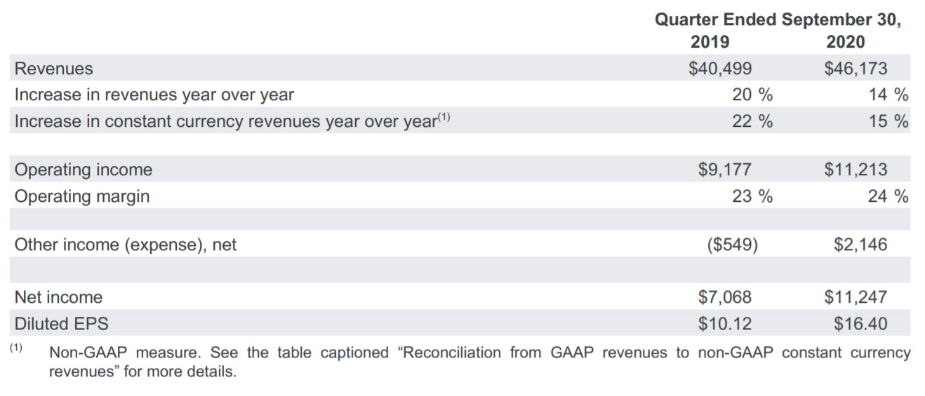 據 Alphabet 財報,2020 年第三季(7~9 月),營收年增 14% 至 461.7 億美元,高於 Refinitiv 調查預估的 429 億美元;稀釋後每股盈餘 16.40 美元,優於分析師預期的 11.29 美元;流量獲取成本(Traffic Acquisition Costs,TAC)為 81.7 億美元,StreetAccount 調查預估則為 76.6 億美元。