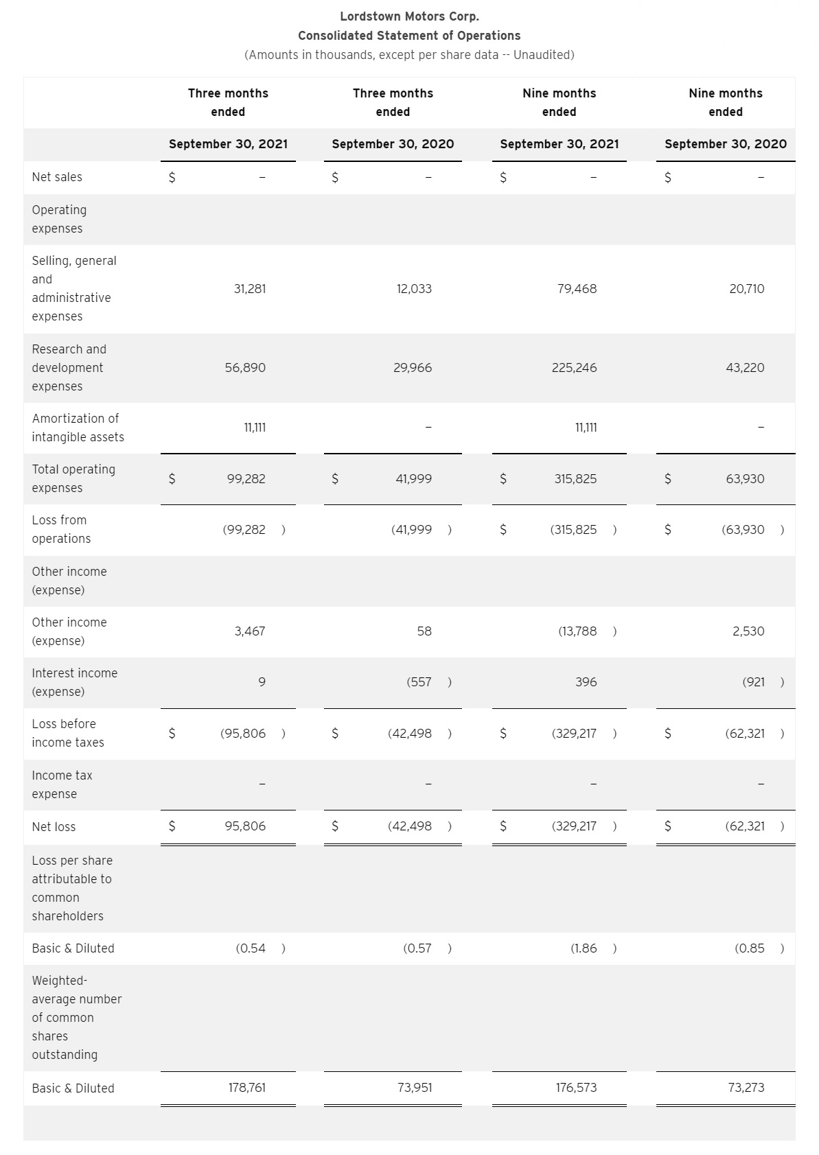 路透社、CNBC等外媒報導,Lordstown於11日美股盤後公布財報,2021年第三季營收0美元;淨損9,580萬美元,即每股虧損0.54美元,略低於分析師預期的每股虧損0.59美元。