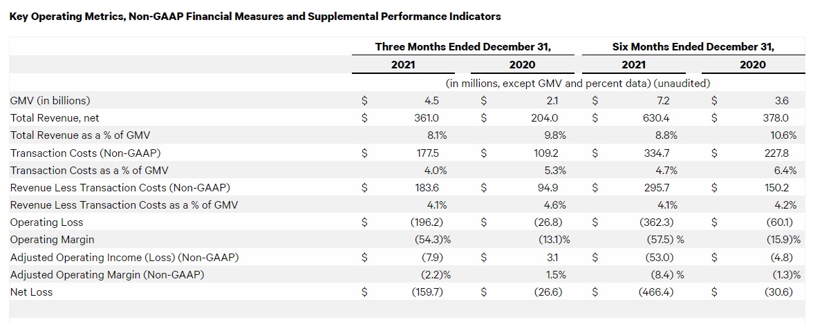 根據Affirm財報資料顯示,2022會計年度第二季(截至2021年12月31日),營收年增77%至3.61億美元,優於Refinitiv共識預期的3.288億美元;營業虧損(Operating loss)從去年同期的2,680萬美元擴大至1.962億美元,其中包括2021年1月IPO後員工獎酬股票費用增加8,200萬美元,以及產品、員工招募和行銷方面的投資金額。