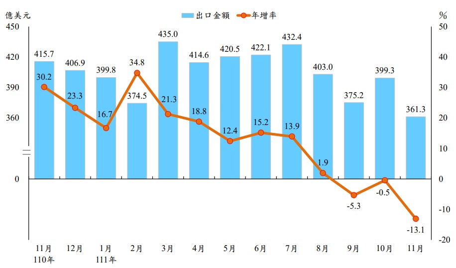 受需求放緩與中國清零的連鎖效應衝擊,外貿旺季效應落空,財政部 7 日公布 11 月出口金額 361.3 億美元、年減 13.1%,創近 7 年來最大跌幅;11 大貨品全面衰退,表現「黯淡無光」,主力貨品電子零組件出口翻黑,終結連 42 紅。