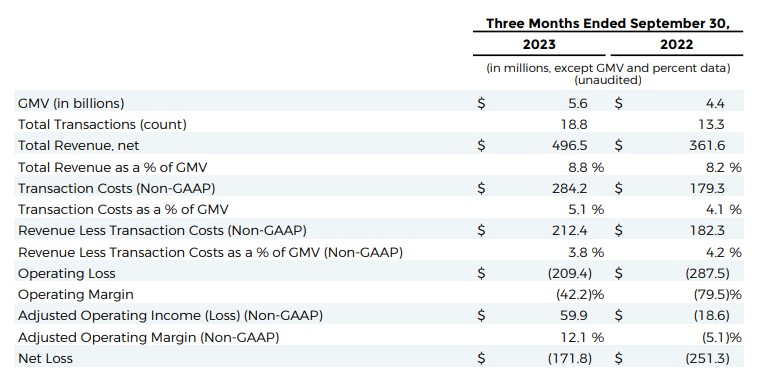 根據Affirm於11月8日美股盤後公布的財報,2024會計年度第一季(截至2023年9月30日),營收增至4.97億美元,較去年同期成長37%,遠高於FactSet調查分析師預期的4.44億美元;淨損1.718億美元,即每股虧損0.57美元,低於FactSet共識預期的每股虧損0.70美元,亦低於去年同期淨損2.513億美元,即每股虧損0.86美元。