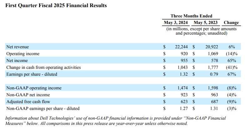 戴爾科技公司(Dell Technologies Inc)於美國股市 5 月 30 日盤後公布 2025 會計年度第 1 季(截至2024年5月3日為止)財報:營收年增 6% 至 222.44 億美元,非依照美國一般公認會計原則(non-GAAP)每股稀釋盈餘年減 3% 至 1.27 美元。