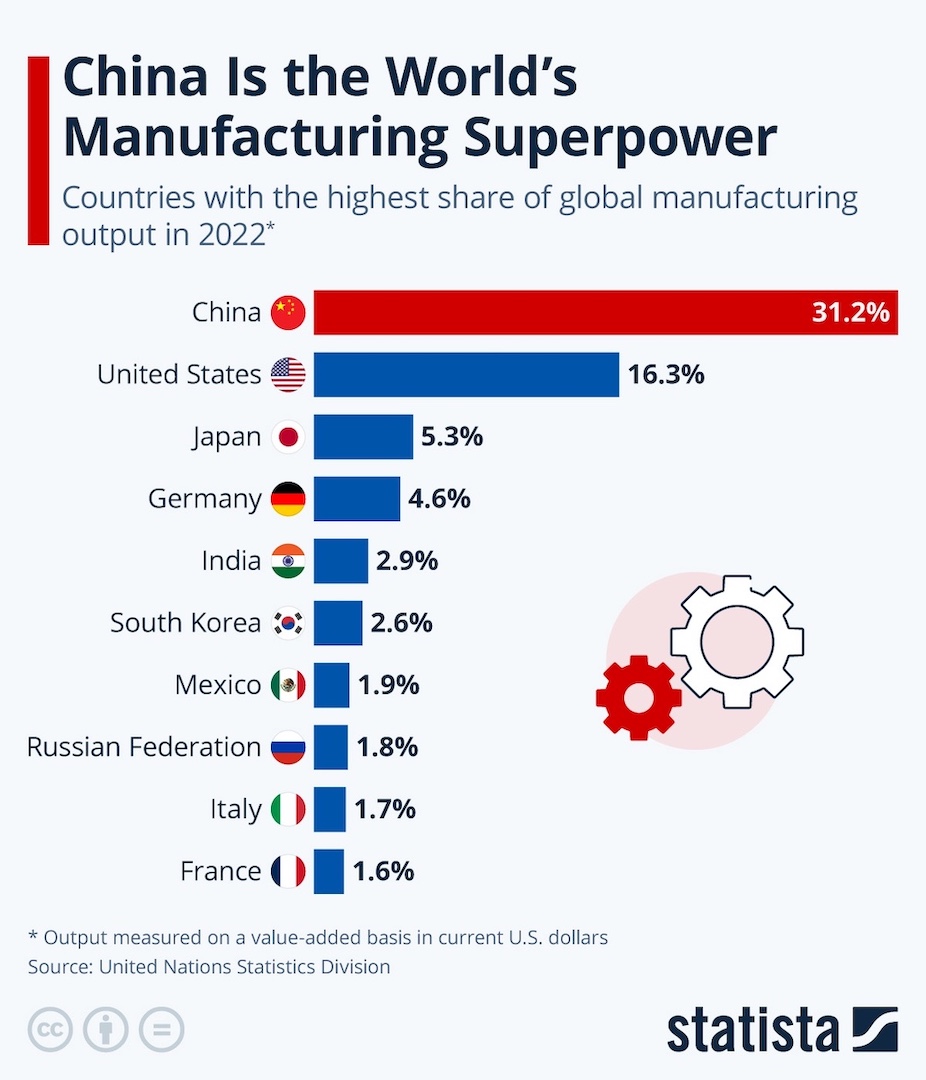 ▲ 中國仍然維持「世界工廠」的強勢地位。(Source:Statista)
