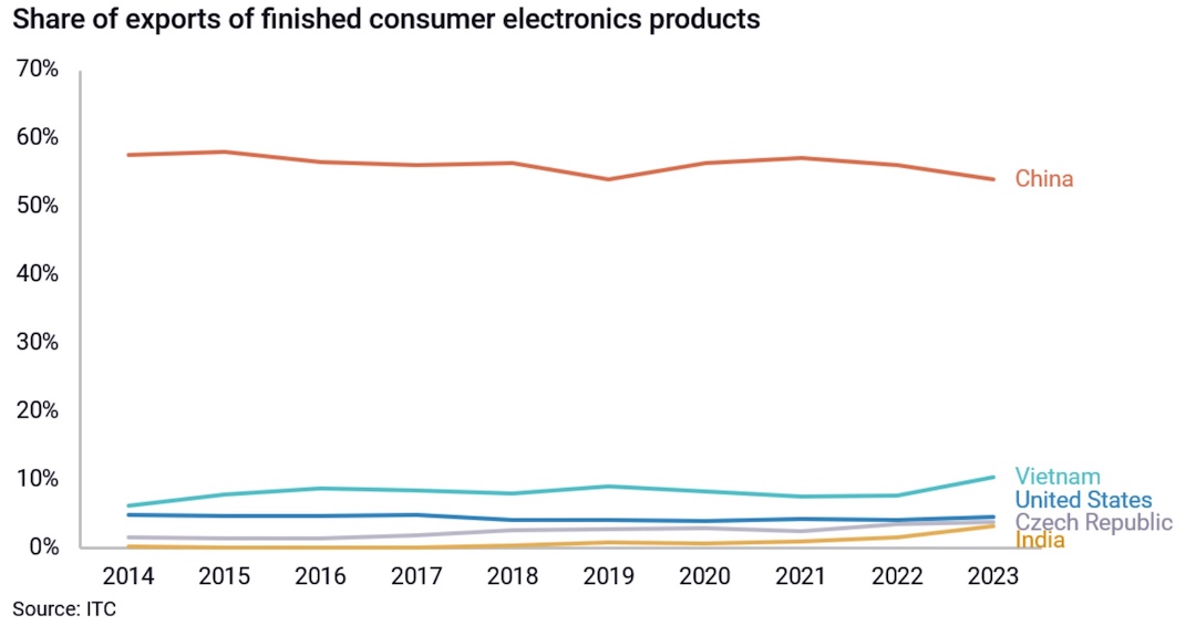 消費電子的全球產業鏈向來高度複雜而分散,過去在 1970 年代,台灣與韓國先承接需要大量中度技術與成本競爭力的終端組裝;但隨著它們向上游延伸,最終也把組裝外移至中國。本來以為中國勞動成本逐漸上漲後會延續這股外移趨勢,然而中國憑藉低物流與能源費用,以及完整供應鏈,依舊掌握了大宗生產。