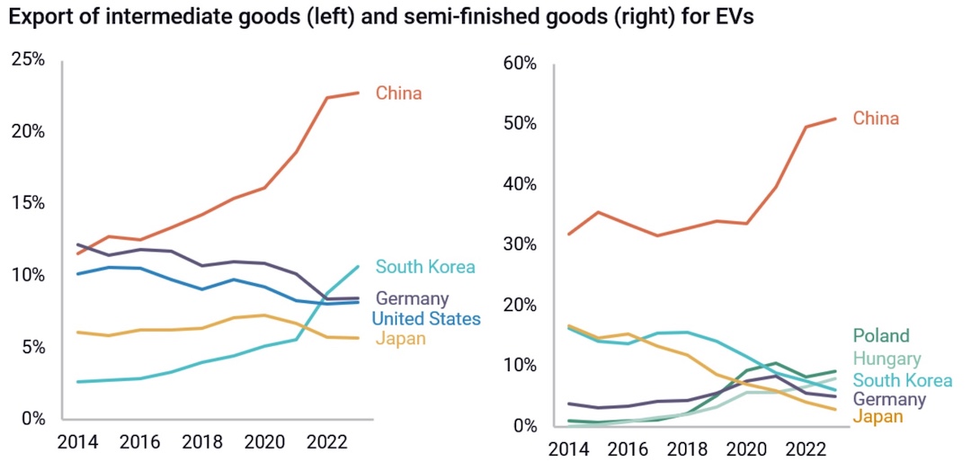 近十年來,中國在汽車供應鏈多數環節的生產市占大幅攀升,不僅迅速減少車輛與零件進口,更開始大量輸出中間投入品與整車。目前中國已是輪胎與煞車系統的出口主導者,也成為車身板件等零組件的重要製造國;在傳統內燃機(ICE)領域尚未躋身出口大國,但已是全球第二大 ICE 零件出口國,正逼近德國。尤為矚目的是乘用車,2023 年中國出口 414 萬輛,超越日本(400 萬)與德國,若按價值計居世界第三,按量則高居第一。