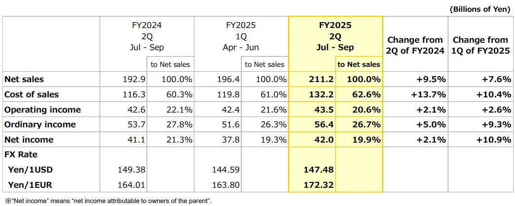 Fanuc並公布上季(2025年7-9月)財報:因機器人訂單大增,帶動合併營收較去年同期成長9.5%至2,112億日圓、合併營益成長2.1%至435億日圓、合併純益增加2.1%至420億日圓。